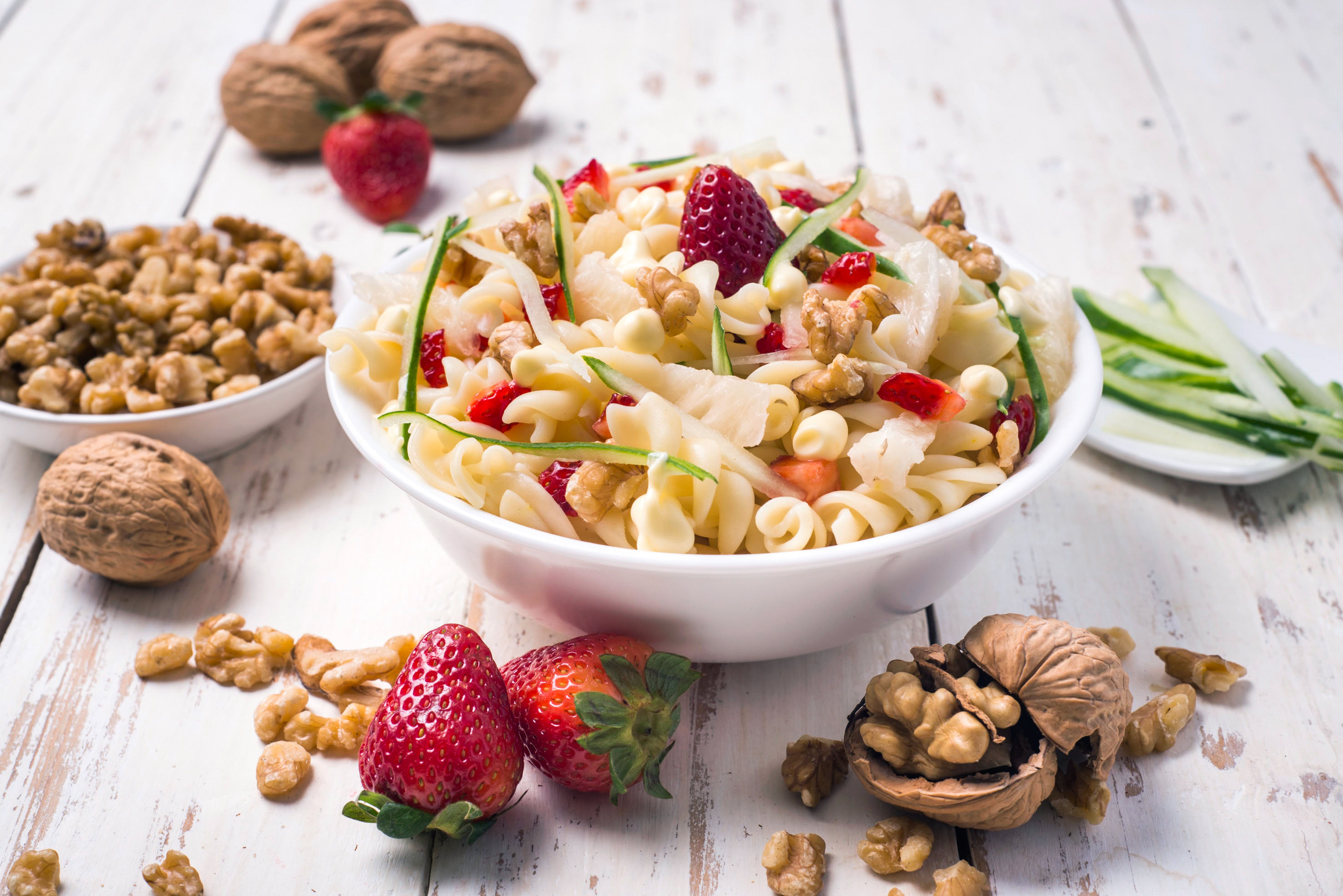 Arbella Nohutlu Burgu Makarna'yı bol kaynamış suda 8-10 dk arası haşlayıp süzün. Derin bir kasede küp doğradığınız çilekleri, jülyen kestiğiniz salatalık dilimlerini, dörde böldüğünüz cevizleri, iri rendelenmiş peyniri, zeytinyağını, balzamik sirkeyi ve haşlanmış Arbella Nohutlu Burgu Makarna'yı hafifçe karıştırın. Servis etmeden önce üzerine birkaç dilim peynir rendesi ilave edin. Afiyet olsun.